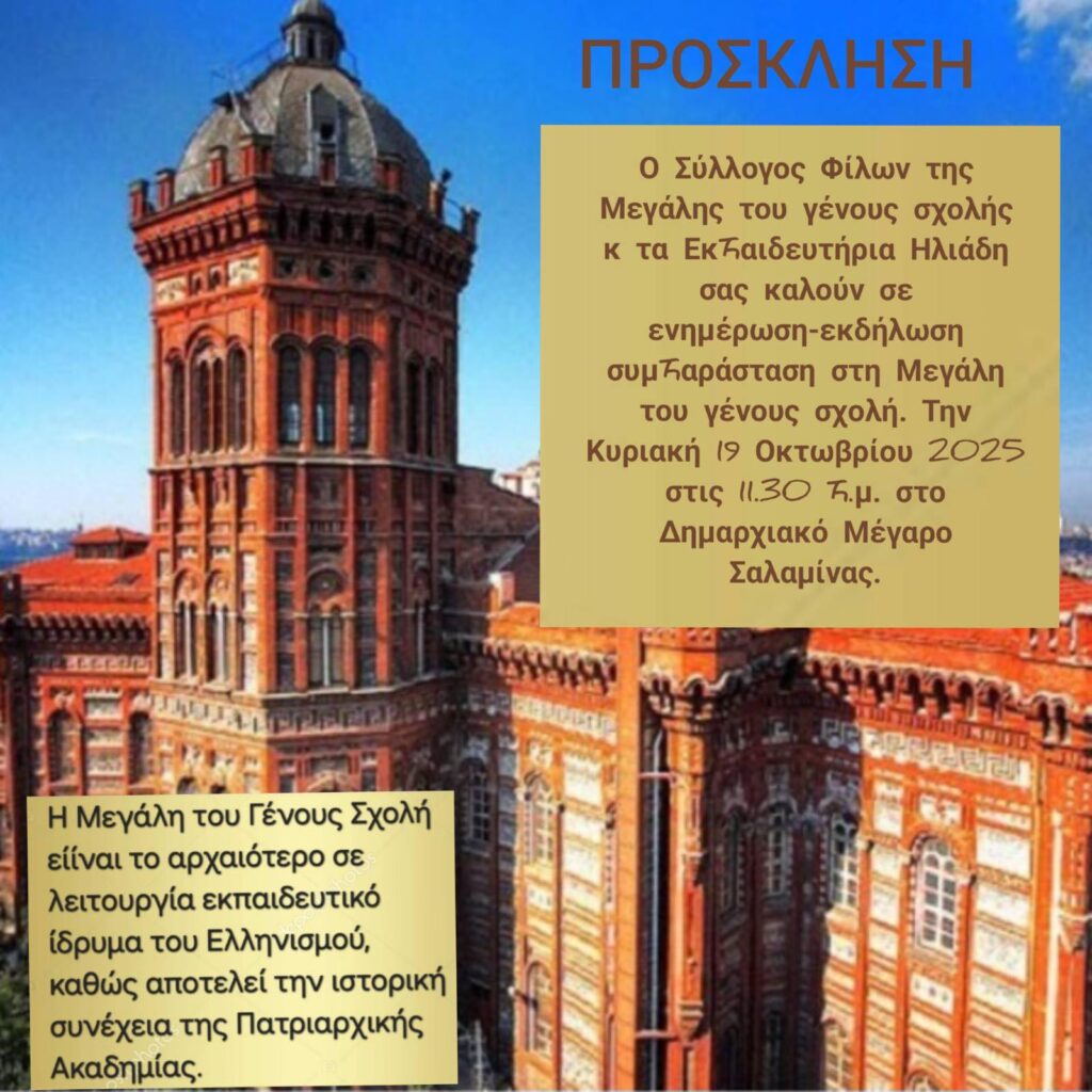 Θερμές ευχαριστίες στον Δήμο Σαλαμίνος και στα εκπαιδευτήρια Ηλιάδη για τον όμορφο εορτασμό για τα 570 χρόνια της Μεγάλης του Γένους Σχολής στο όμορφο Δημαρχείο της Σαλαμίνας! Έγινε προβολή μέρους του ντοκιμαντέρ για την ΠΜΓΣ. Τον σύλλογο των Φίλων της ΠΜΓΣ εκπροσώπησαν η αντιπρόεδρος κ. Μ.Παπαγγελοπούλου-Μπελδέκου και Ιδρυτικό μέλος του Δ.Σ. κ. Νέλλα Ηλιοπούλου, η οποία και μίλησε στο κοινό για την κατάσταση , και ευχαρίστησε τον Δήμο Σαλαμίνας και τα εκπαιδευτήρια Ηλιάδη για την υποστήριξή τους στην ΠΜΓΣ με την οποία είχε γίνει στο παρελθόν και αδελφοποίηση. Σας ευχαριστούμε φίλοι μας για την φιλοξενία και την συγκίνηση που μας δώσατε με τους υπέροχους μικρούς μαθητές οι οποίοι μας τραγούδησαν ωραία Κωνσταντινοπολίτικα τραγούδια! Δάσκαλοι, μαθητές και η μαέστρος της χορωδίας Θεώνη Μούλτου , με την υπέροχη συνοδεία του πιάνου με την Χρύσα Σοφρά εξαιρετικοί! Επίσης μαζί με τα παιδιά ο τραγουδιστής Μάκης Μαυρουδής Ψαραδέλης . Την γιορτή τίμησαν κ με την παρουσία τους ο Δήμαρχος Σαλαμίνας Γιώργος Θ. Παναγόπουλος , ο Αντιπεριφερειάρχης Νήσων, Νικόλαος Παπαγεωργίου, η Αντιπεριφεριάρχης υπεύθυνη της περιφέρειας για τον εθελοντισμό,κ.Ευγενία Μπαρμπαγιάννη, αντιδήμαρχοι,κ.α. επίσημοι. Στο τέλος της όμορφης αίθουσας τελετών του Δημαρχείου Σαλαμίνας είχαν αναρτηθεί τα ζωγραφικά έργα των μαθητών με θέμα την Μεγάλη του Γένους Σχολή , τα οποία θα συμμετέχουν και στον Διαγωνισμό που ακόμη τρέχει από την Παιδική Πινακοθήκη Ελλάδος ! Καλή επιτυχία μικροί μας μαθητές!! Ευχαριστούμε θερμά και για την αναμνηστική πλακέτα με την τριήρη της Σαλαμίνας τον Δήμαρχο και το Δημοτικό Συμβούλιο.